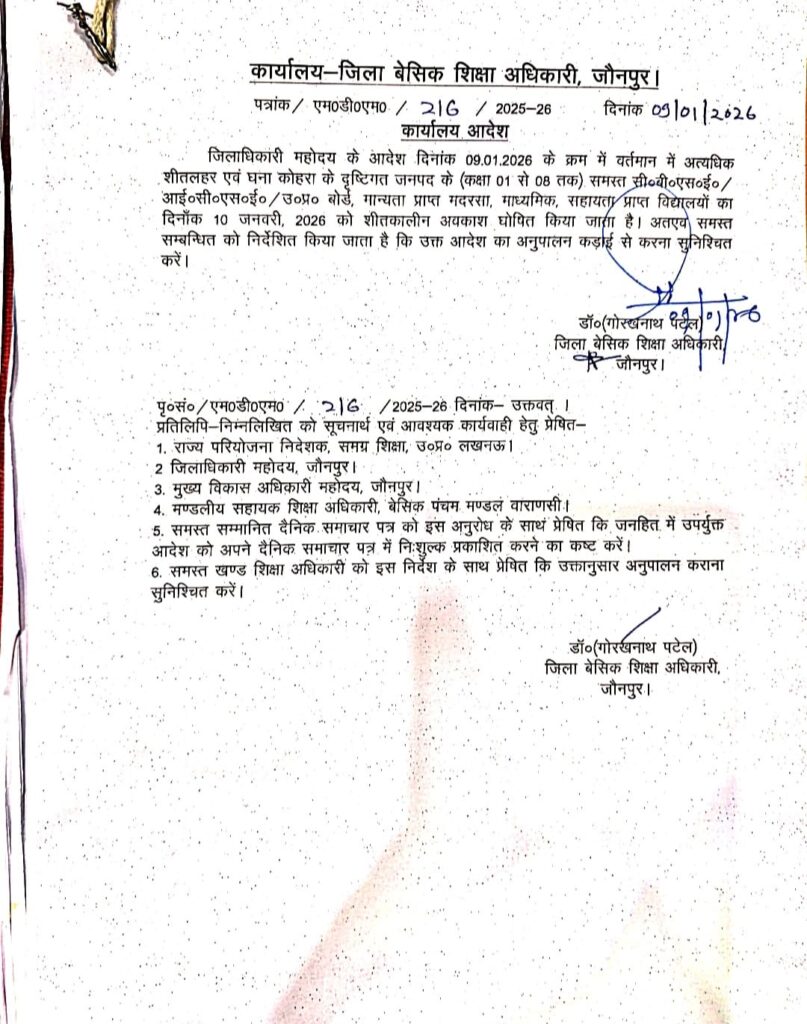 जौनपुर-जिले में पड़ रही अत्यधिक शीतलहर एवं घने कोहरे को देखते हुए जिला प्रशासन ने विद्यार्थियों की सुरक्षा के लिए महत्वपूर्ण निर्णय लिया है। जिला बेसिक शिक्षा अधिकारी कार्यालय जौनपुर द्वारा जारी आदेश के अनुसार, जिलाधिकारी के निर्देश क्रम में जनपद के समस्त परिषदीय विद्यालय, मान्यता प्राप्त मदरसा, सहायता प्राप्त, आईसीएसई, सीबीएसई व अन्य बोर्ड से संबद्ध विद्यालयों में कक्षा 01 से 08 तक दिनांक 10 जनवरी 2026 को शीतकालीन अवकाश घोषित किया गया है। आदेश में सभी संबंधित अधिकारियों एवं विद्यालय प्रबंधन को निर्देशित किया गया है कि उक्त आदेश का कड़ाई से अनुपालन सुनिश्चित करें।